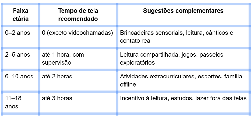 11 a 18 anos: até 3 horas por dia, garantindo ainda tempo para estudos, esporte e socialização.