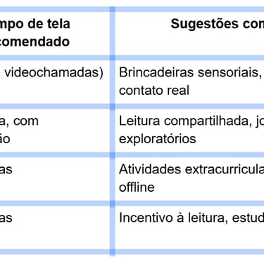 6 a 10 anos: até 2 horas por dia, com equilíbrio entre atividades digitais e físicas.